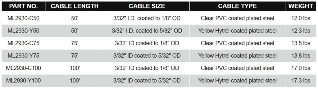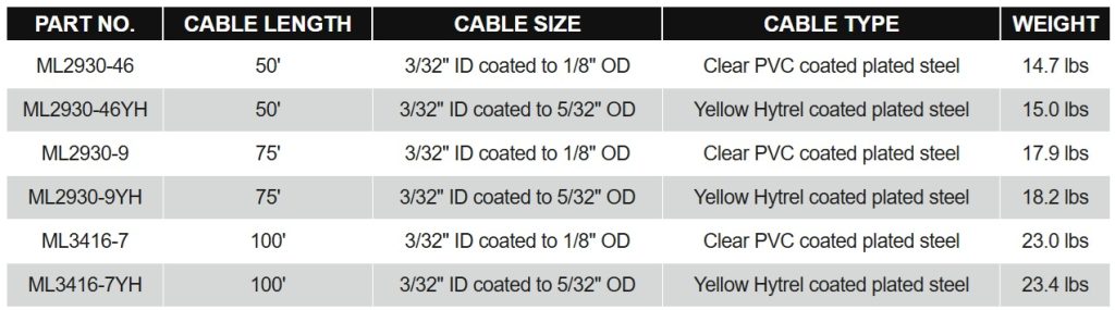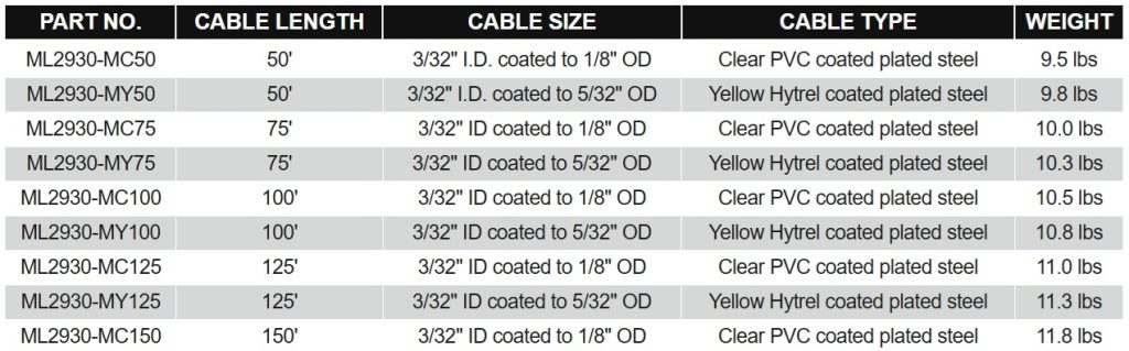 • CAPACITY: 125′ with 5/32″ O.D. cable, 150′ with 1/8″ O.D. cable