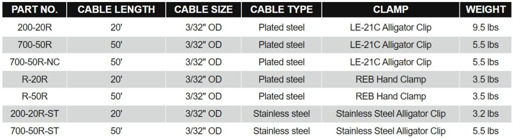 A latching mechanism holds the cable at any desired length.  A slight pull on the cable releases the mechanism causing retraction.   A ball and adjustable cable stop on the cable assembly keep the cable end within easy reach.  The standard models include the LE-21C alligator clamp.
